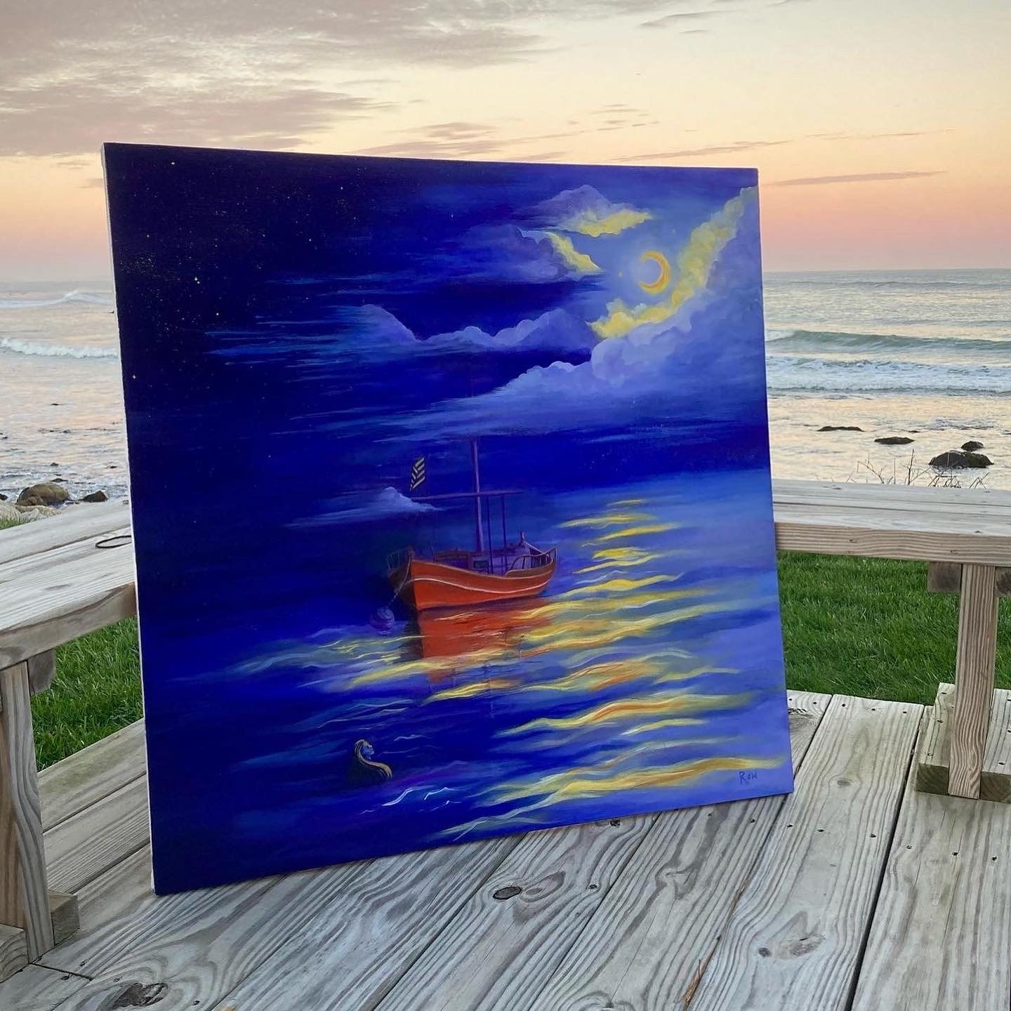I work with clients to execute their creative visions through each step of the process. The first step is to decide on the content and size of the painting. From that point we establish the contract and begin designing a “mock up” drawing. Once we have agreed on a composition, I build the canvas and start work on the final piece! I accept painting commission requests on a rolling basis. Please feel free to reach out with any questions about the process, what the contract looks like, or pricing.